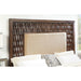 Introduce a stunning rustic element to your bedroom with this intricately carved set. The footboard and side rails of this bed are fairly simple and unadorned, to show a warm chestnut finish. The headboard is a stark contrast to the rest of the bed's design, featuring a padded fabric panel framed by elaborate panels of alternating waves of carved wood. The pattern is echoed on the faces of the case goods for a design that is filled with depth. The final product is reminiscent of wicker and traditional basket patterns found in country settings.