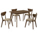 It’s easy to enjoy mid-century modern style in small spaces with this five-piece dining table set. A sleek and simplistic dining table is constructed with a rectangular tabletop and tapered legs, while four chestnut dining chairs incorporate everything that you love about mid-century modern design. The iconic half-moon shaped backrest complements the eye-catching triangular cushion. Each cushion is upholstered in leatherette with tan color. Coming in the same style as a table, four dining chairs are supported on tapered legs.